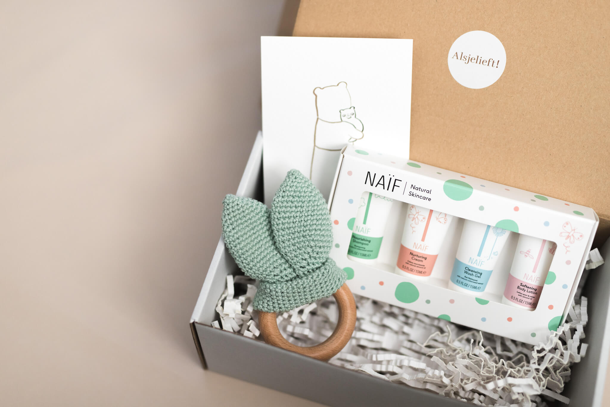 Cadeaupakket versturen? Dit pakketje met leuke kraamcadeaus is een feestje om te geven én krijgen! In dit cadeaupakket zit een handgemaakte bijtring en een setje mini’s van Naïf.Houten bijtring konijnenoortjes Deze houten bijtring met gehaakte konijnenoortjes en knisperfolie is een leuk kraamcadeautje! Verkrijgbaar in groen, roze en blauw en handgemaakt door Eline Boezaart van Liefdevol door Eline. De houten ring is BPA-vrij en voldoet aan de Europese veiligheidsnormen, helemaal babyproof dus.Mini-set NaïfDe mini-set bevat 4 natuurlijke producten: