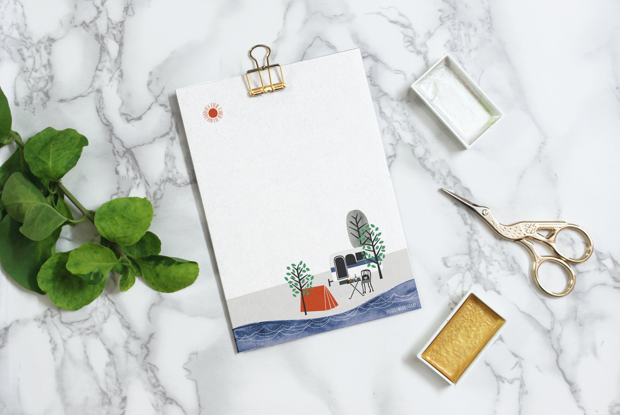 Kaart ‘Kamperen aan zee’, gemaakt door Antoinette Verhoeven van Studio Zwaanstraat. Een vrolijk vakantiekaartje!
