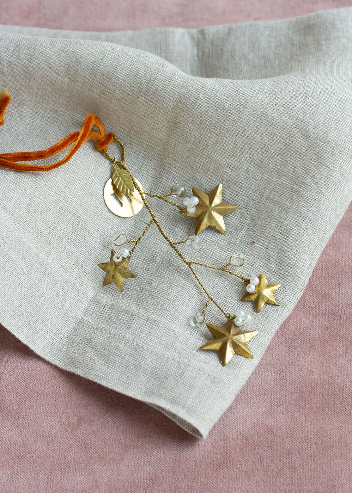 Mooi messing sterrentakje van Weldaad Authentic Interior. De kleine gouden sterretjes en subtiele witte kraaltjes zorgen voor een warme, feestelijke uitstraling. Prachtig om op tafel te leggen, in een tak of krans te hangen, of om een cadeautje extra mooi in te pakken.
